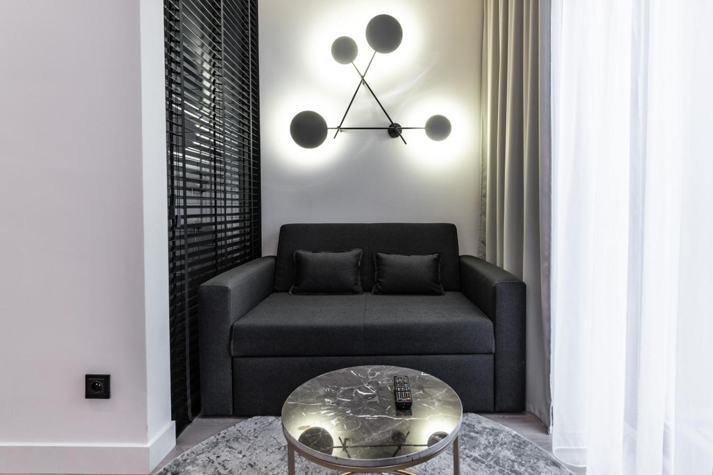 Apartament z tarasem. W tym apartamencie mieści się salon oraz oddzielna sypialnia, a także łazienka z prysznicem typu walk-in i bezpłatnymi przyborami toaletowymi. W dobrze wyposażonej kuchni przygotowano płytę kuchenną, lodówkę, zmywarkę do naczyń i przybory kuchenne. Udogodnienia w tym apartamencie obejmują część wypoczynkową oraz telewizor z płaskim ekranem i dostępem do kanałów satelitarnych. Z tarasu roztacza się widok na miasto. W tej opcji zakwaterowania dostępne są 2 łóżka. Apartament - 4 osobowy. Powierzchnia pokoju ok.: 50 mkw. ;