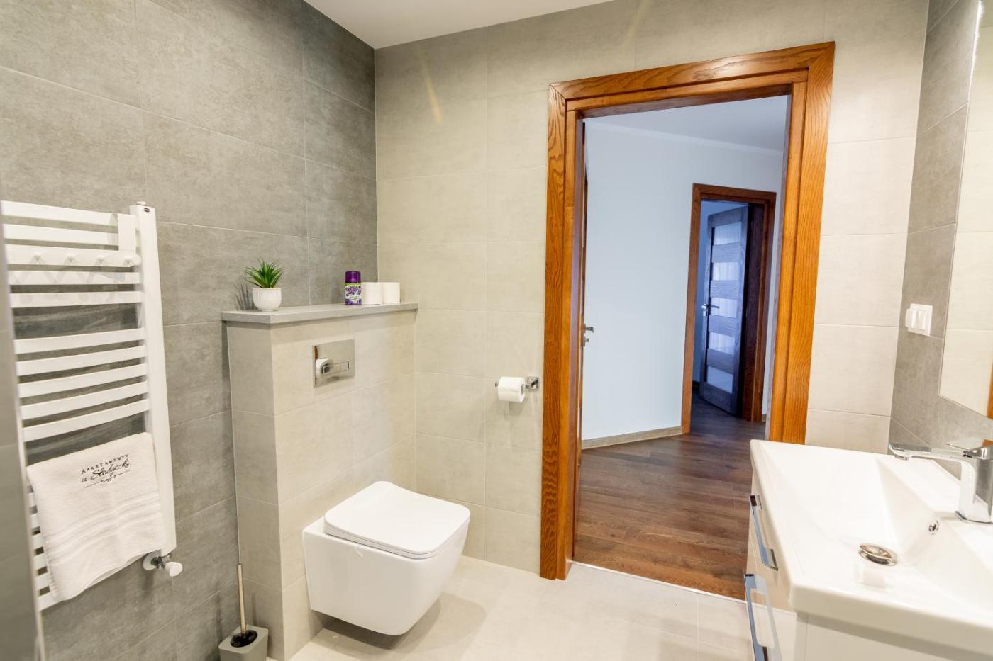 Apartament z 3 sypialniami. This apartments standout features are the hot tub and sauna. This spacious apartment features 1 living room, 3 separate bedrooms and 2 bathrooms with a walk-in shower and a hairdryer. Guests will find a stovetop, a refrigerator, kitchenware and a microwave in the fully equipped kitchen. The apartment also comes with a barbecue. Boasting a balcony with garden views, this apartment also features a tea and coffee maker and a flat-screen TV. The unit has 7 beds. Apartament - 8 osobowy. Powierzchnia pokoju ok.: 75 mkw. ;